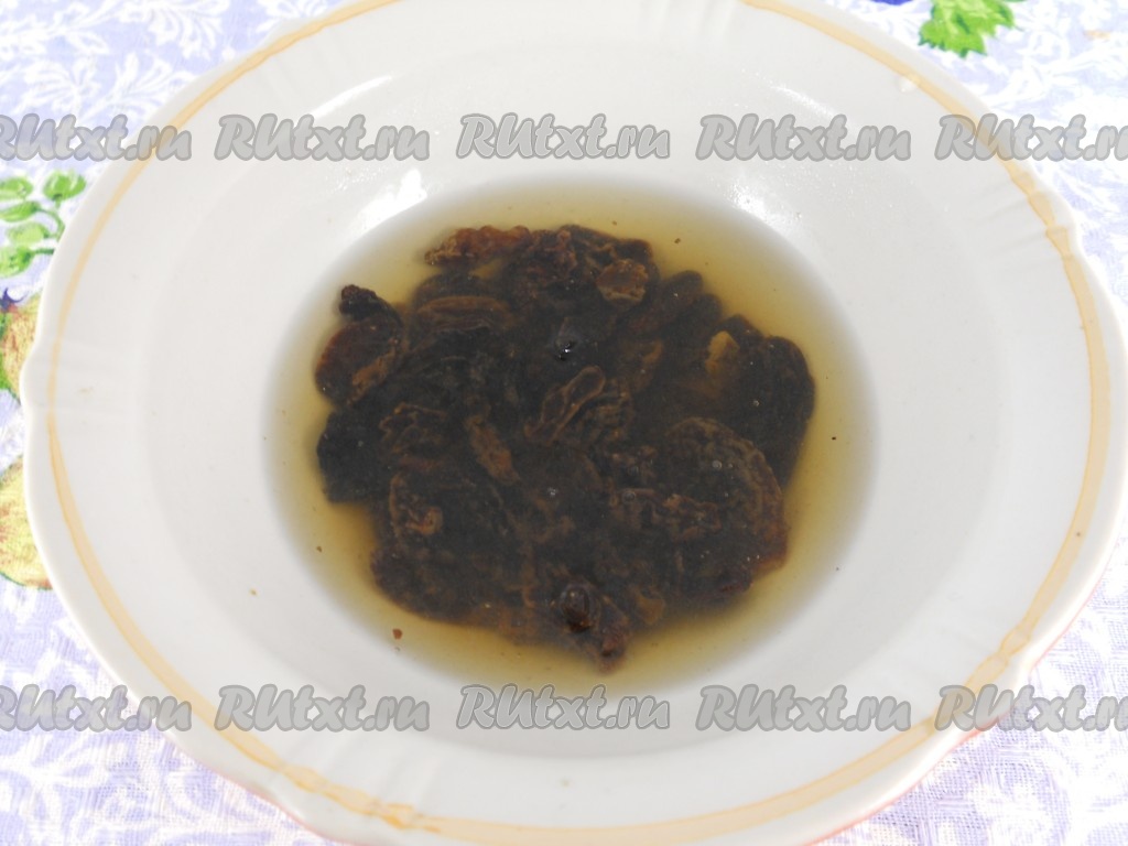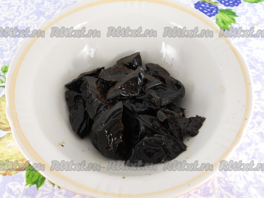 Чернослив также замочить в кипятке на 10 минут, после чего воду слить, чернослив порезать на 2-4 части.