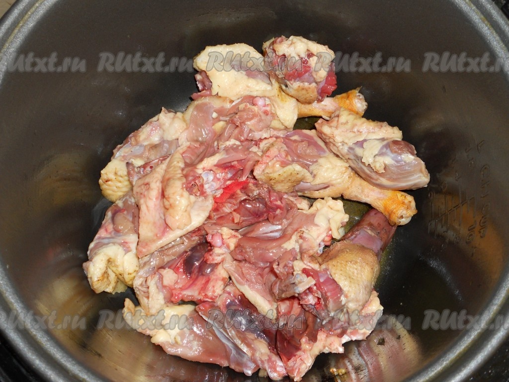 Жир утиный (шкуру) порезать маленькими кусочками и поместить в чашу мультиварки. Выставить режим "Жарка" на 10 минут. После того как жир вытопится из шкуры, кусочки выбросить. В жир выложить утку, порезанную на средние куски. Кусочки утки выкладывать кожей вниз. Готовить на том же режиме еще 15 минут. Через 7-8 минут утку перевернуть.