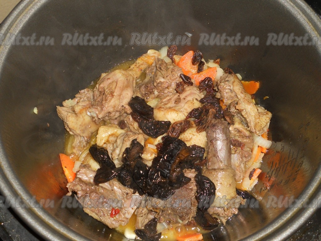 Далее утку посолить, добавить изюм и чернослив.