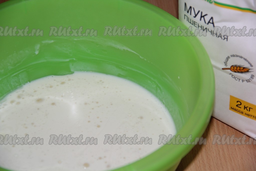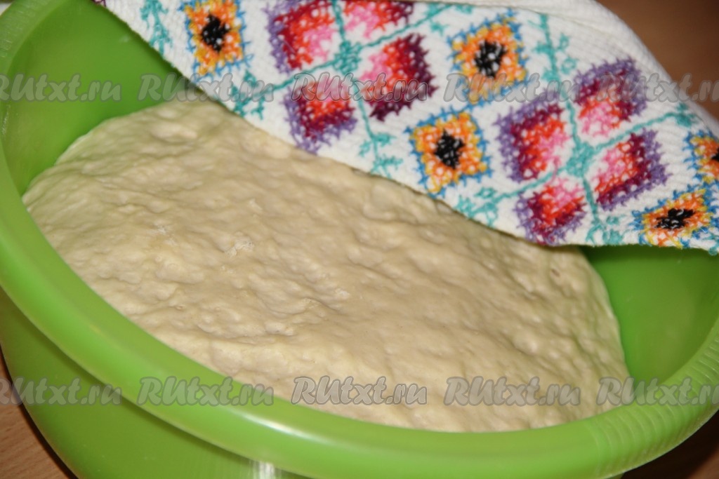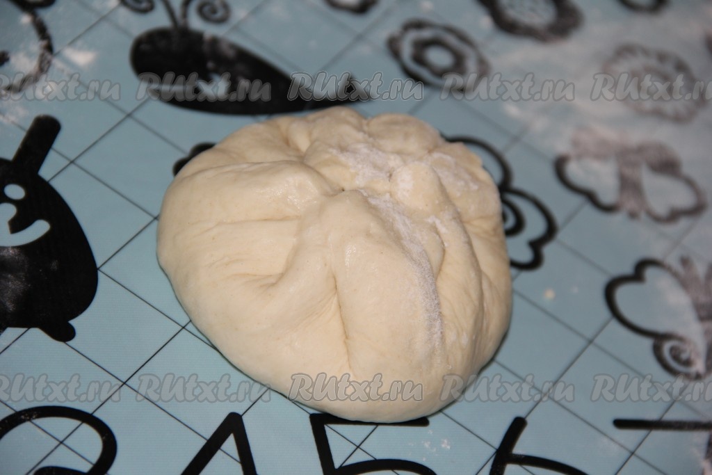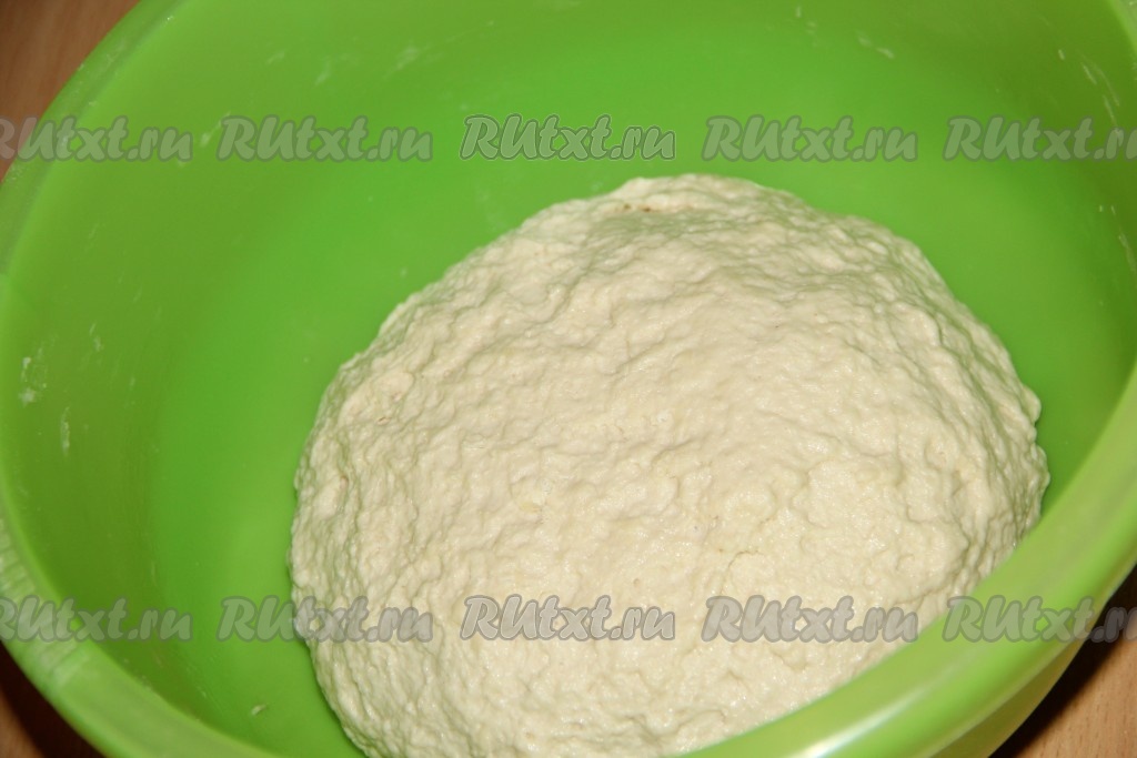 Затем добавляем просеянную муку и замешиваем мягкое тесто. В конце замеса вливаем растительное масло и хорошо вымешиваем тесто. Накрываем миску с тестом полотенцем и оставляем в теплом месте на 1 час.