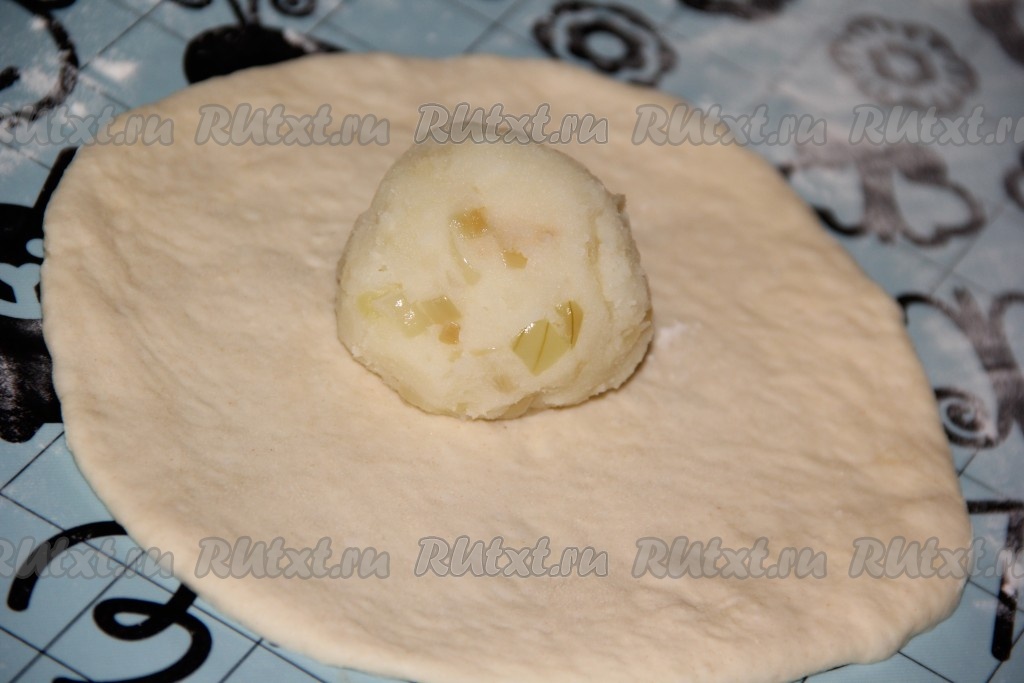 Из каждой части теста раскатываем (не тонко) круг. Берём 1 столовую ложку (с горкой) начинки и скатываем плотный картофельный шарик. Выкладываем начинку в центр круга.