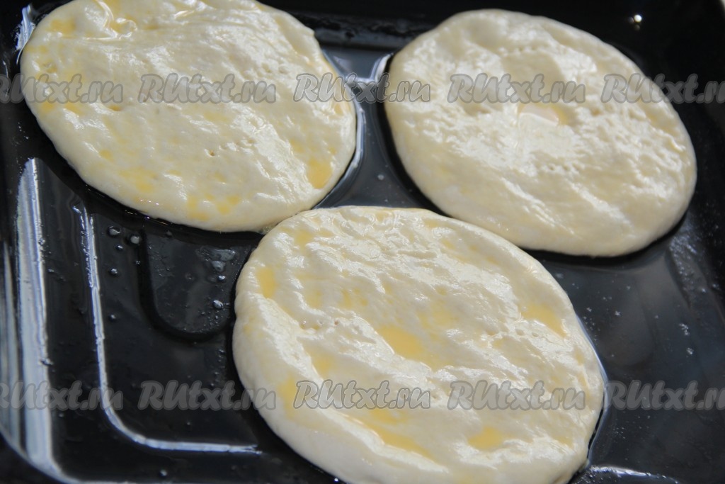Каждый мешочек переворачиваем защипом вниз, немного приминаем рукой, а затем аккуратно раскатать скалкой, чтобы получились лепёшки. Лепёшки с картошкой перекладываем на противень, смазанный растительным маслом. Верх лепёшек смазываем взбитым яйцом.