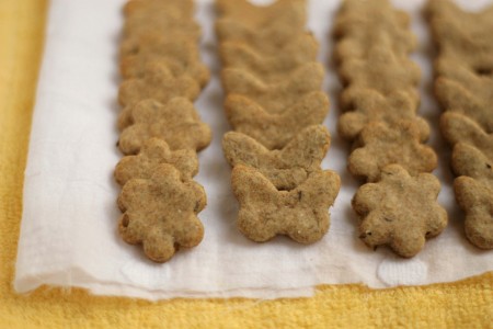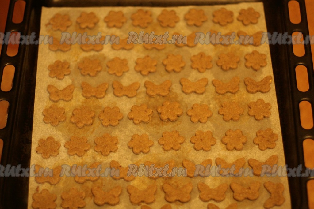 Вырезаем крекеры формочками для печенья. Перекладываем бумагу с заготовками крекеров на противень.
