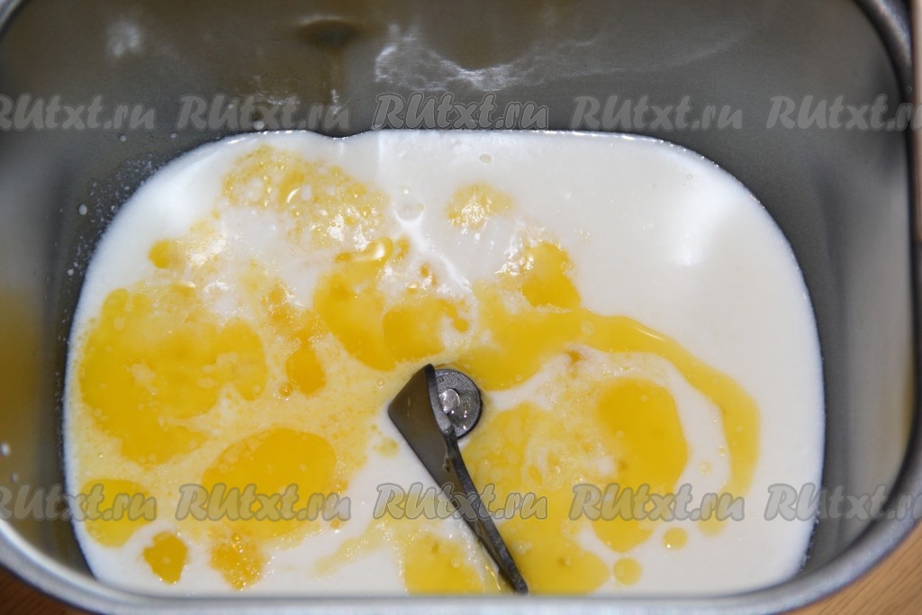 В ведёрко хлебопечки влить простоквашу комнатной температуры, растопленное сливочное масло и добавить сахар.