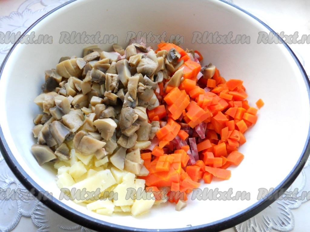 Морковь нарезать кубиками, маринованные шампиньоны - кусочками. Добавить грибы и морковь к картошке с колбасой.