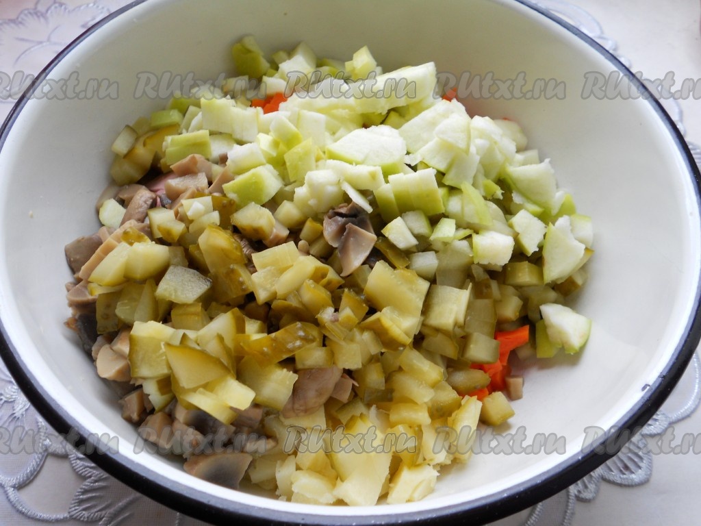 Яблоко очистить от кожуры и семян. Нарезать на небольшие кубики яблоко и маринованные огурчики, добавить в миску.