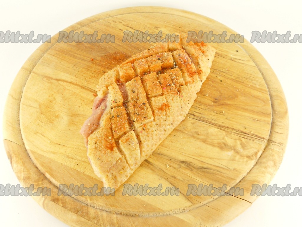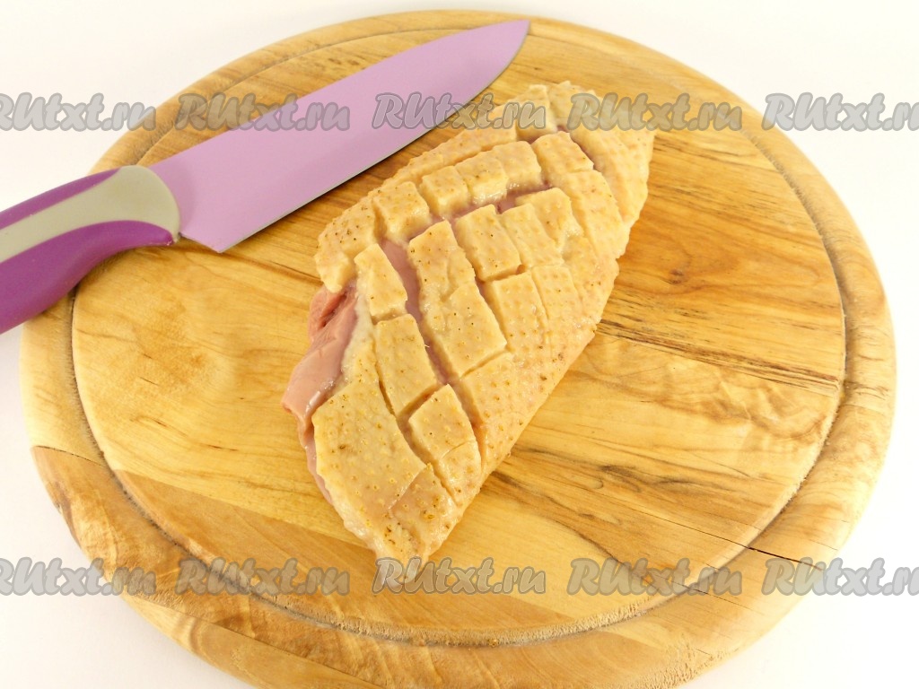 На коже утиного филе сделать крестообразные надрезы.
