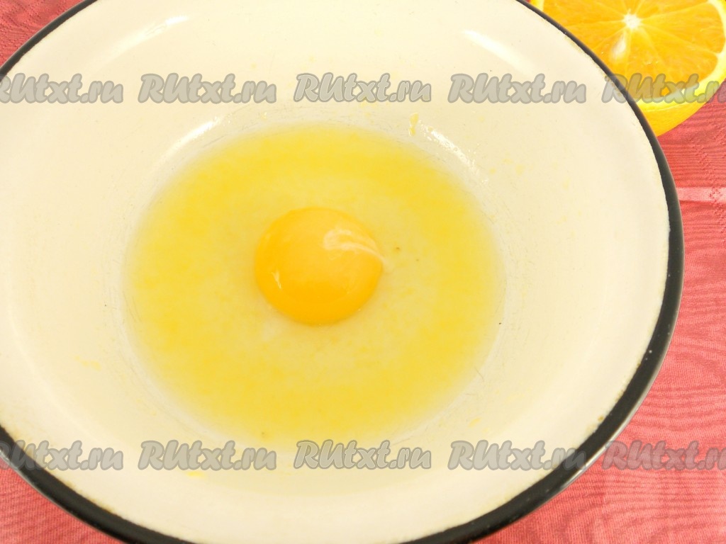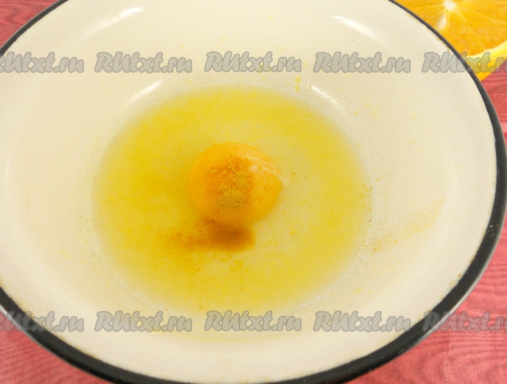 Пока утиная грудка "доходит" в духовке, приготовить апельсиновый соус. Для этого в небольшую посуду поместить сырой желток, выжать сок из 1/4 апельсина.