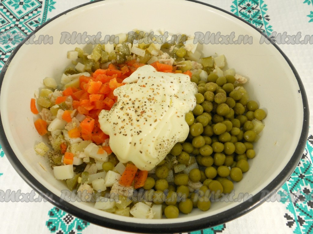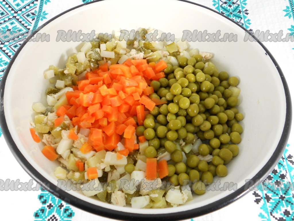 Куриное филе отварить в подсоленной воде до готовности (в течение 25-30 минут с момента закипания воды), остудить. Картофель и морковь очень хорошо вымыть и отварить в кожуре до готовности (в течение 25-30 минут после закипания воды, готовые корнеплоды будет легко прокалываться вилкой). Отварить в течение 9-10 минут с момента закипания яйцо. Остудить варёные картофель, морковь и яйцо, очистить. Картофель и куриное филе нарезать на небольшие кубики, выложить в миску.