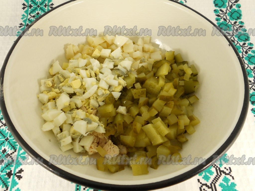 Добавить нарезанные на небольшие кубики солёный огурец и яйцо. Нарезая ингредиенты для салата "Столичный", нужно стараться, чтобы все кубики были размером с консервированный горошек, тогда блюдо получится особенно вкусным.