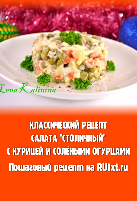 Аппетитный салат "Столичный" можно оформить с помощью кулинарного кольца или выложить в салатник, украсить зеленью петрушки и подать к повседневному или праздничному столу. Это блюдо, приготовленное по классическому рецепту с курицей и солёными огурцами, непременно порадует вас приятным вкусом, а кому-то навеет и приятные воспоминания!