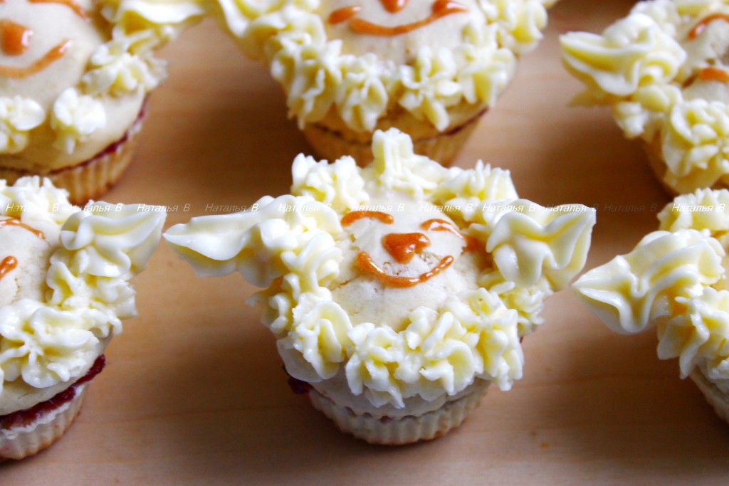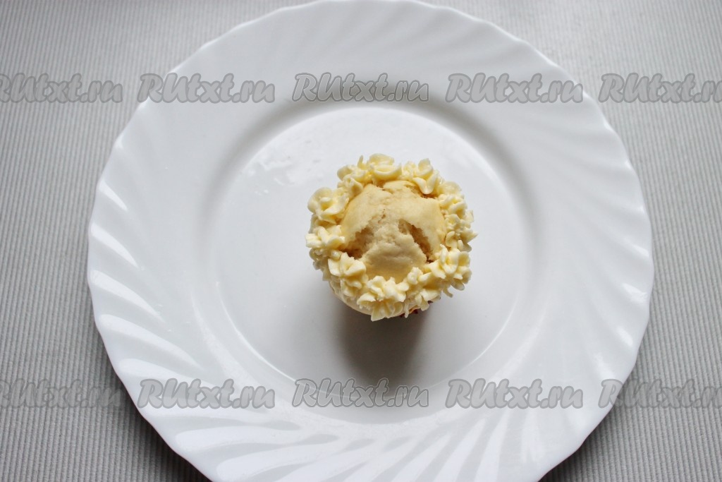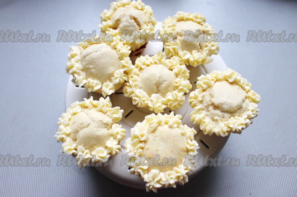Маффины украсить кремом с помощью кондитерского мешка с зубчатой насадкой.