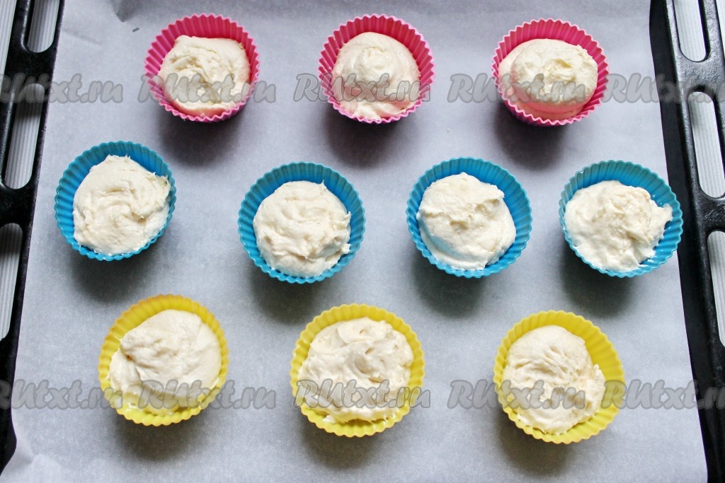 Формочки установить на противень (у меня силиконовые для мини кексов), заполнить на 2/3 тестом. Выпекать в заранее разогретой до 200 градусов духовке 20-25 минут.