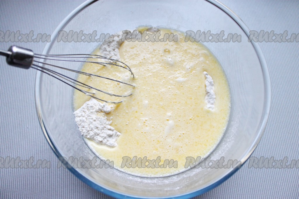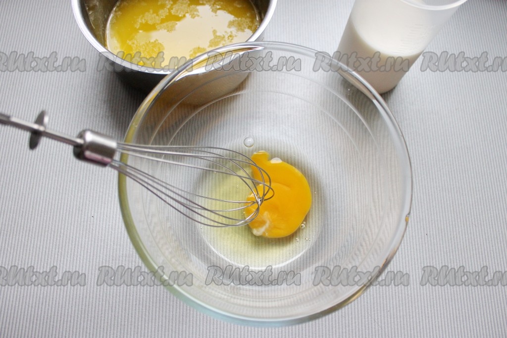 В отдельной мисочке соединить теплое молоко, яйцо и охлажденное растопленное масло, все слегка взбить.