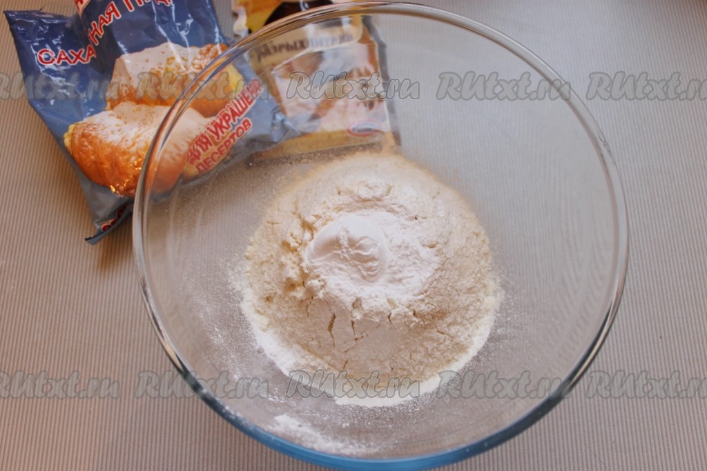 Муку, разрыхлитель и сахарную пудру просеять в широкую миску.
