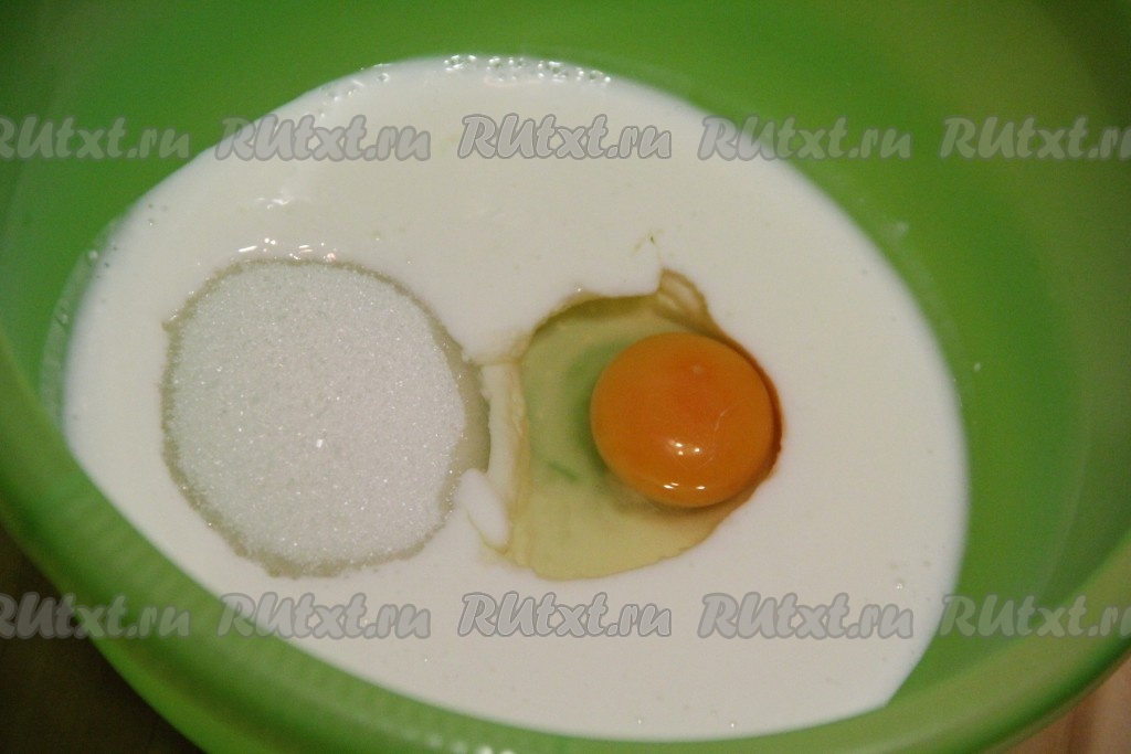 Кефир подогреть до комнатной температуры (я подогрела в микроволновке), затем вылить в глубокую миску. К кефиру добавить яйцо, сахар, соль, соду и хорошо перемешать венчиком.