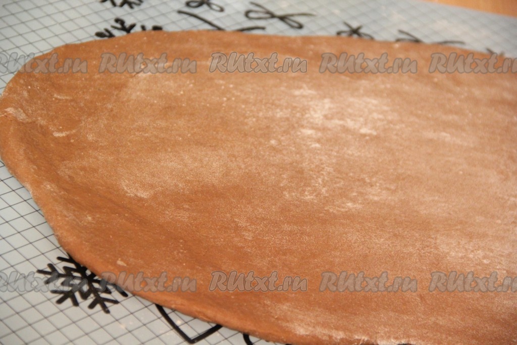 На поверхности, присыпанной мукой, раскатать скалкой тесто в пласт толщиной примерно 1-1,5 сантиметра.