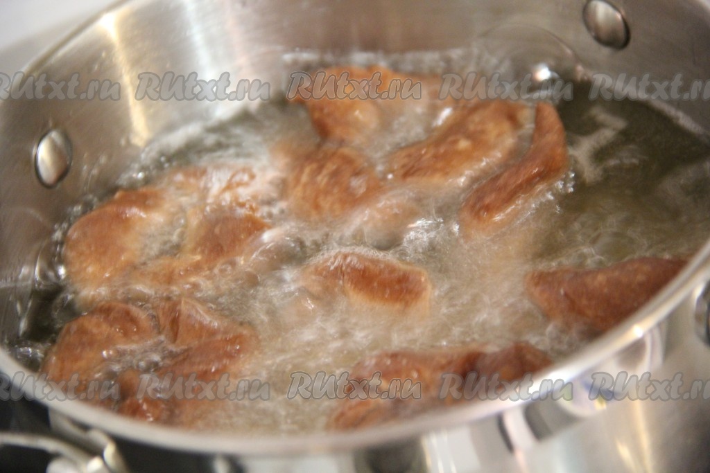 В глубокой кастрюле с толстым дном (или на сковороде) разогреть достаточно большое количество растительного масла, уменьшить огонь до среднего. Аккуратно опустить в масло несколько пышек и обжарить их до готовности с двух сторон (жарятся пышки в масле минуты 3-4). Жареные пышки выложить на бумажное полотенце, чтобы убрать излишки масла.