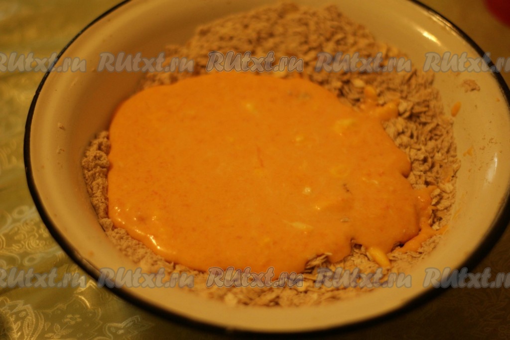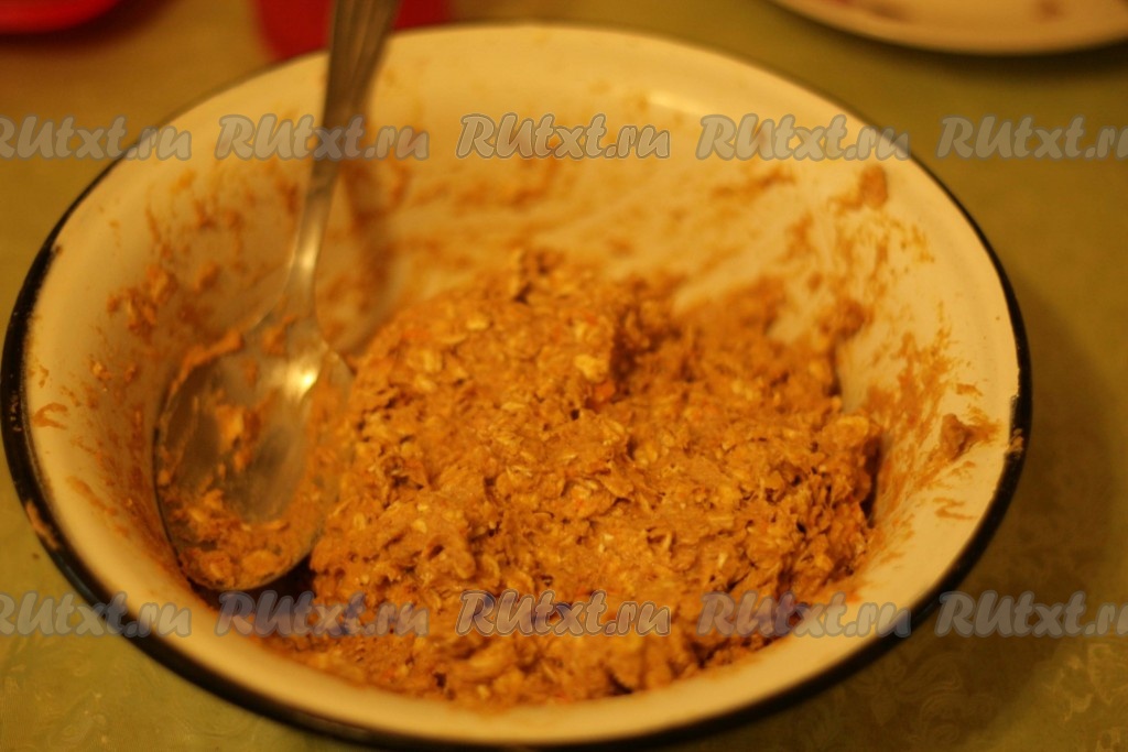 Тщательно перемешиваем ложкой. Затем всыпаем частями оставшуюся муку, замешивая в меру густое, вязкое тыквенно-овсяное тесто, как на фото. Как только добились нужной густоты теста, значит больше муку добавлять не нужно.