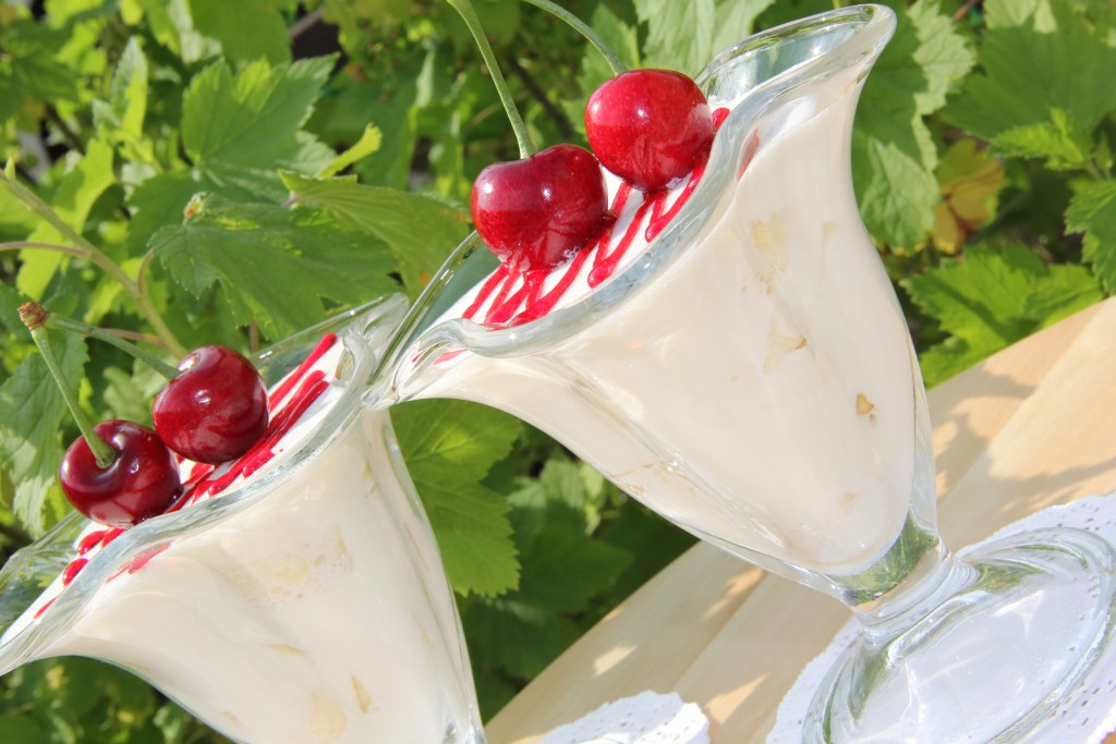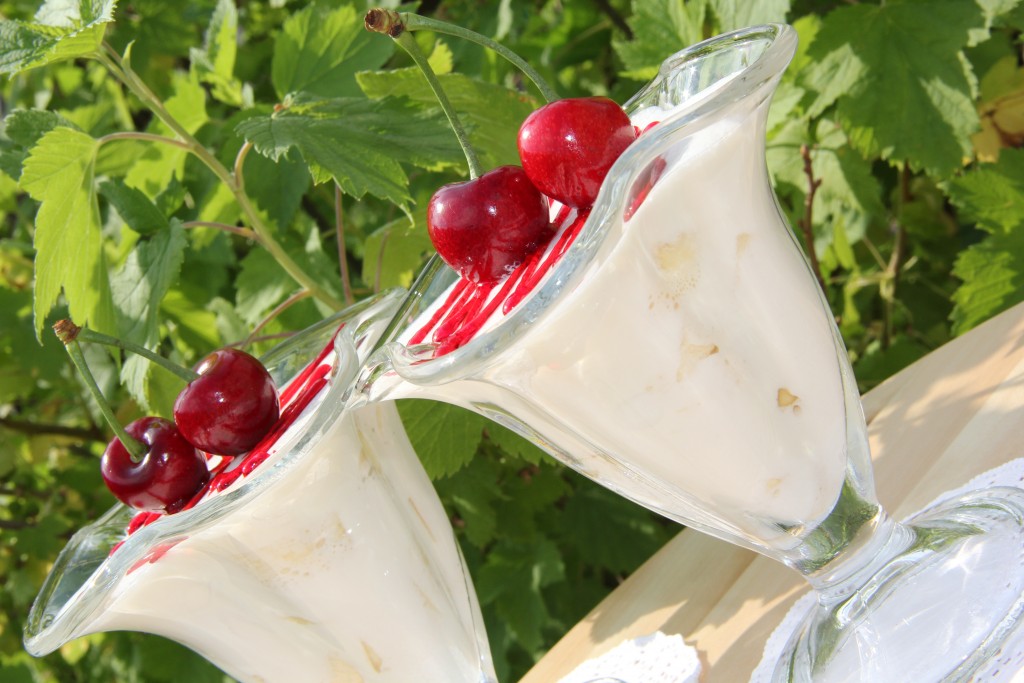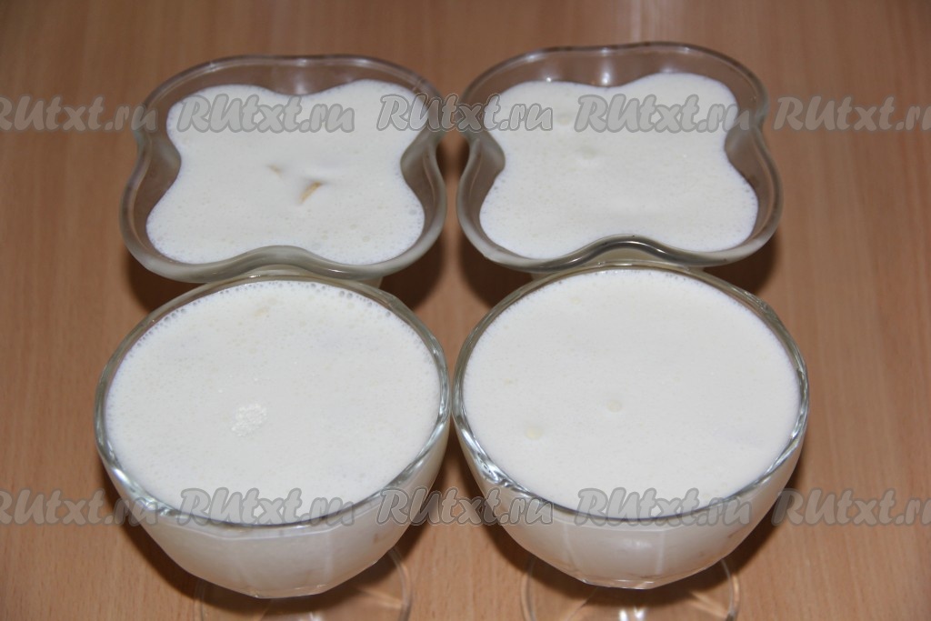 Бананы залить подготовленной творожной массой. Поставить креманки с десертом в холодильник до полного застывания.