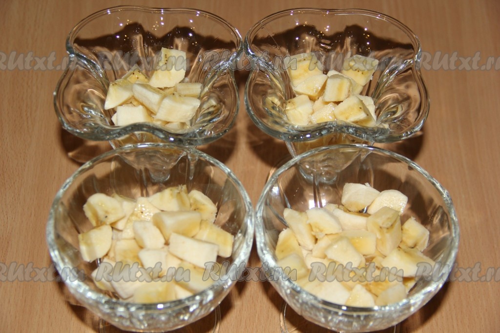 Бананы очистить. На дно креманок выложить бананы, порезанные на кусочки.