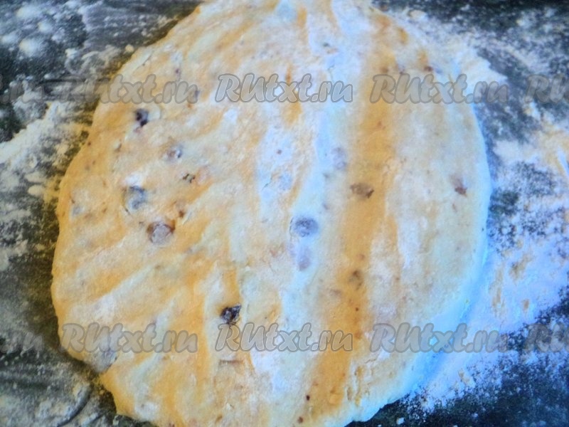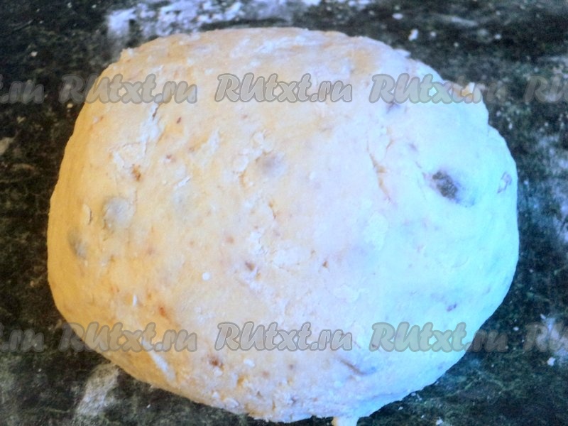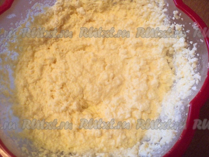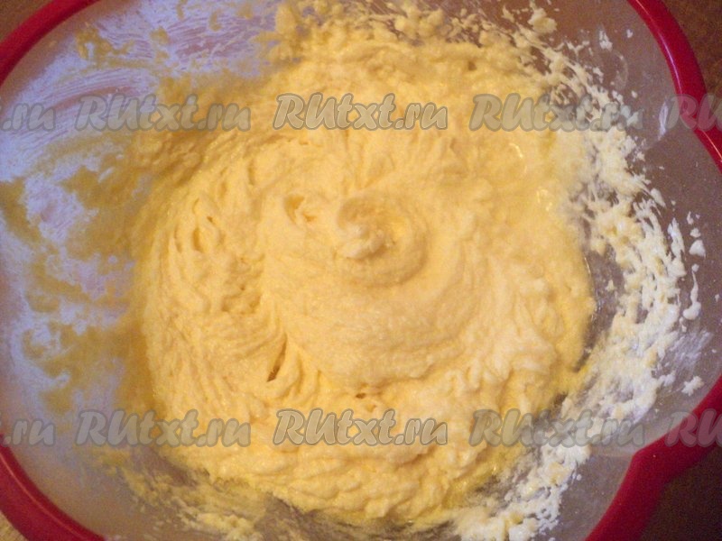 Затем добавить муку, смешанную с разрыхлителем, замесить тесто. Если тесто будет липнуть к рукам, добавить немного муки.