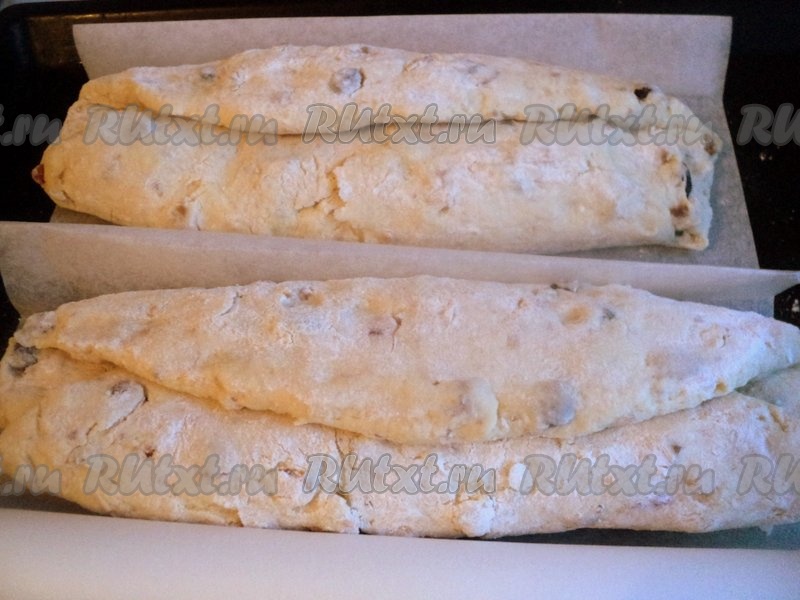Выложить подготовленные творожные штоллены на противень, застеленный бумагой для выпечки. Чтобы тесто не расплывалось, сделать бортики из бумаги для выпечки.