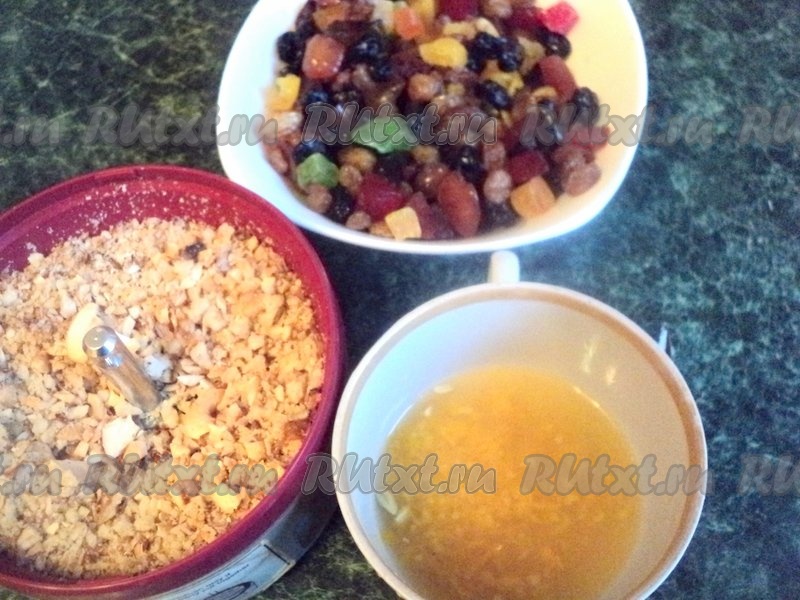 Изюм и цукаты заранее залить коньяком. Орехи нарезать не очень мелко. Снять цедру с лимона и выдавить сок.