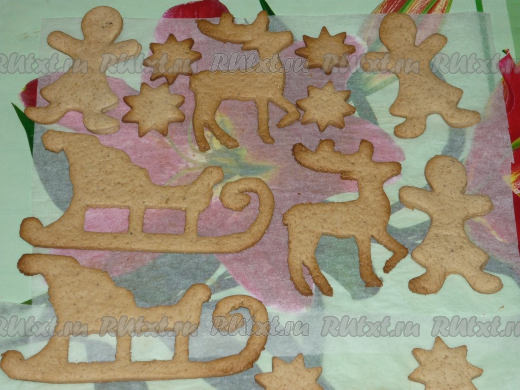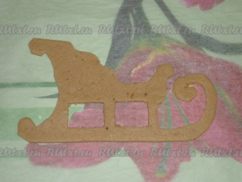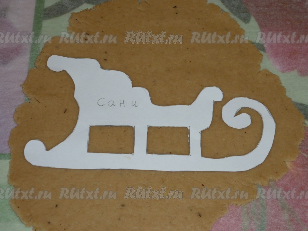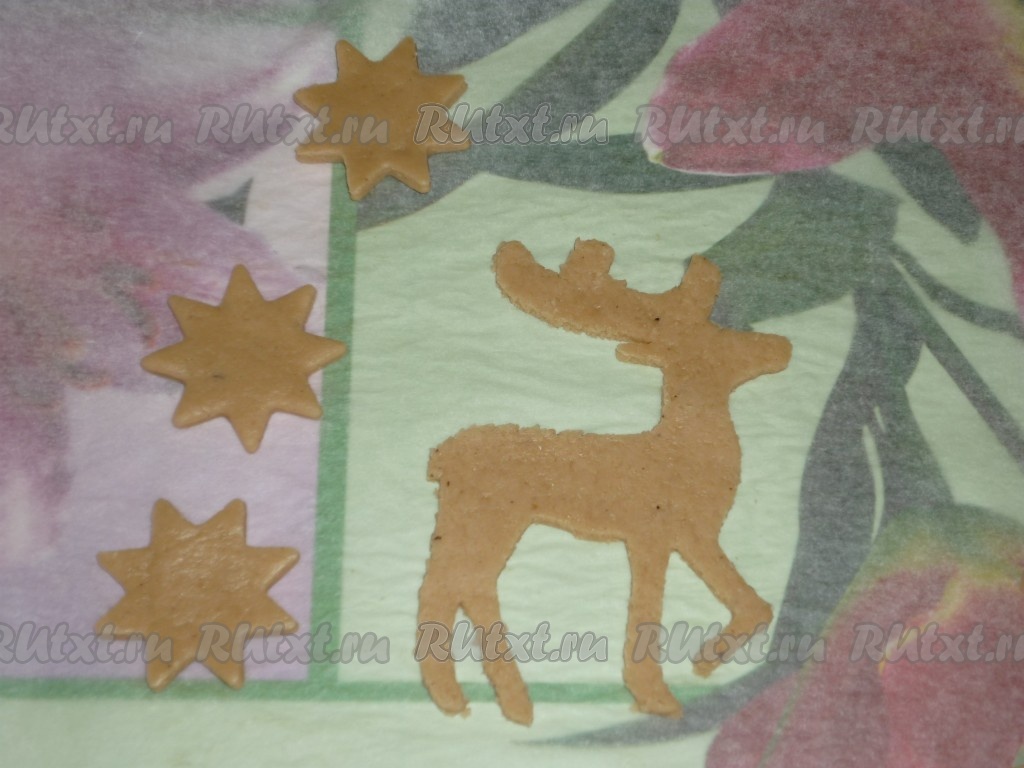 Раскатать тесто на пергаменте, чтобы при переносе детали не деформировались. Вырезать детали с помощью заранее приготовленных трафаретов. Также можно использовать формы для печенья.