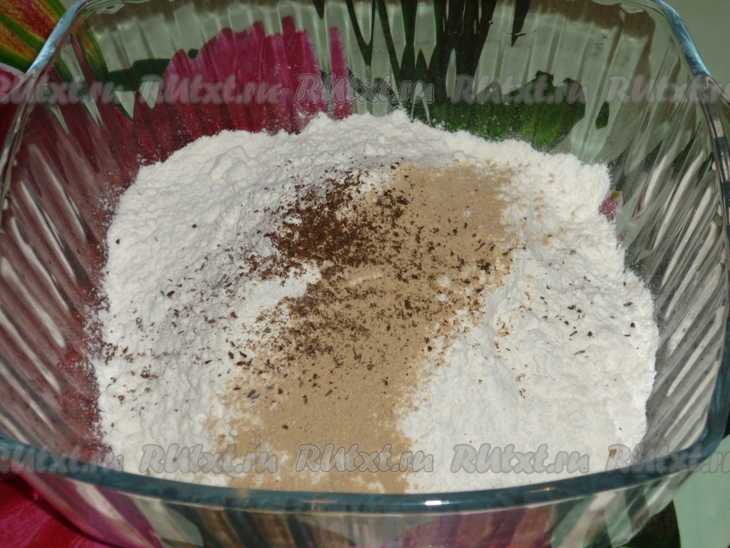 Муку просеять с разрыхлителем, добавить какао-порошок и молотые имбирь, гвоздику.