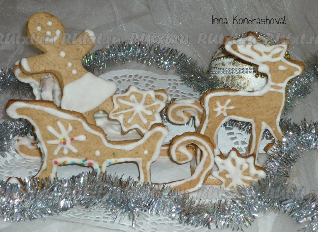 Хочу предложить Вам очень красивую новогоднюю выпечку из имбирного пряничного теста, украшенную белковой глазурью. Такая выпечка отлично подойдёт для новогодних угощений или подарков.