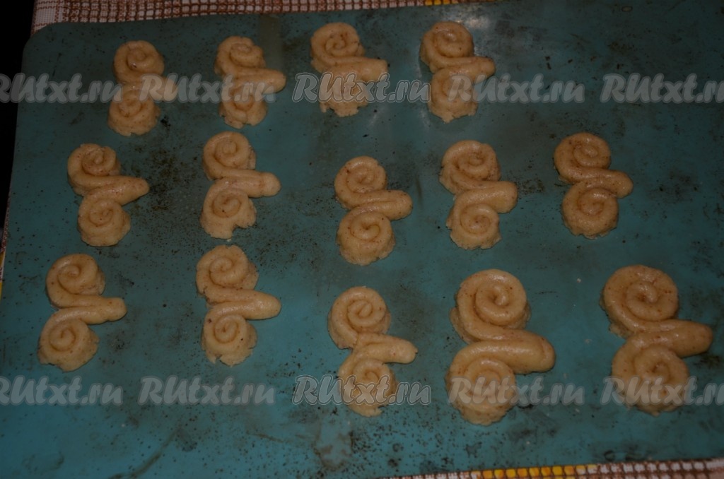 4. От теста отрывать небольшие кусочки (по 10-13 грамм) и скатывать жгутики-колбаски длиной около 10 см. Разрезать каждую колбаску по середине (не до конца). Скатать кончики в "рожки". Переложить полученное печенье "Барашки" на противень, застеленный бумагой для выпечки, и отправить на 15 минут в духовку, разогретую до 180 градусов.