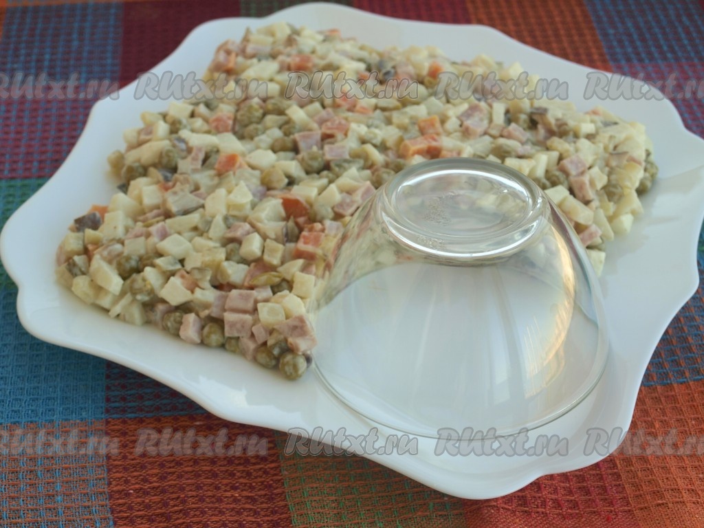 Подготовить плоскую тарелку, лучше квадратную. На угол поставить чашку или подходящую ёмкость. Салат выложить в форме русского кокошника. Подровнять со всех сторон.