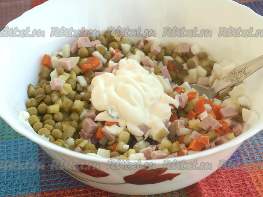 Добавить в миску консервированный горошек без жидкости и заправить салат майонезом.