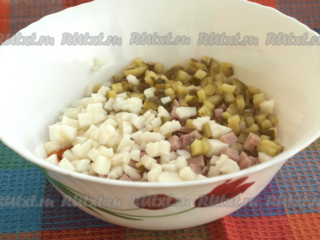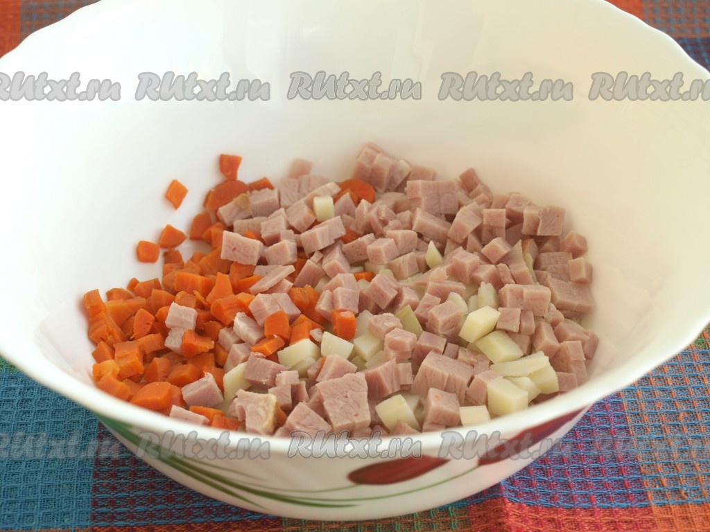 Нарезать кубиками картофель, морковь и ветчину. Сложить в глубокую миску.