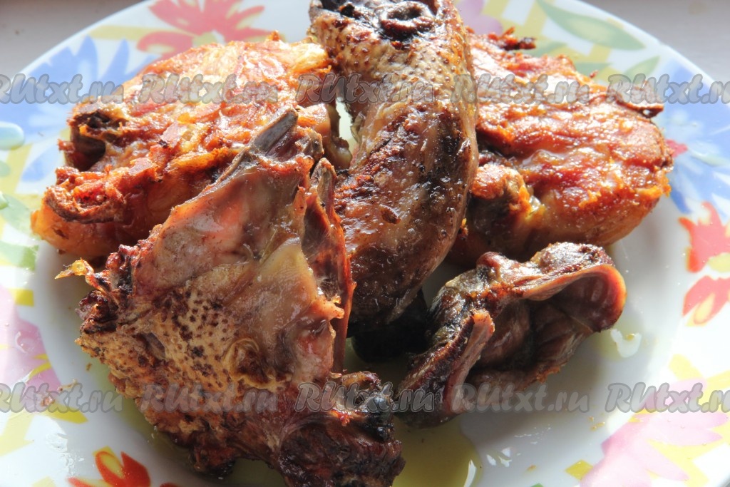 Куриные части или кости промыть под проточной водой и запечь в разогретой духовке до золотой корочки при температуре 200 градусов в течение 15-20 минут.