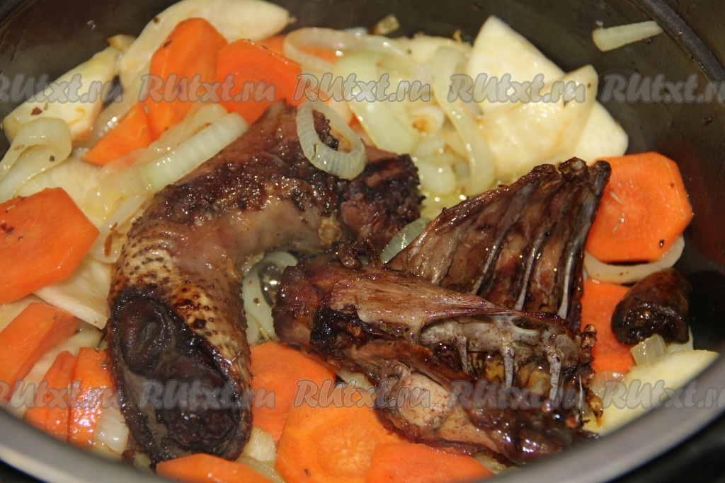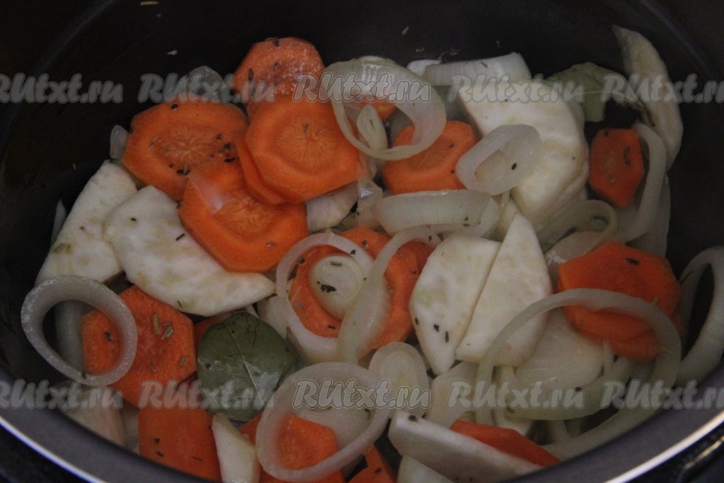 В скороварке или сковороде обжарить на растительном масле порезанные лук, чеснок, морковь, сельдерей и лук порей до легкого румянца. Добавить все специи, приправы и муку, перемешать. Добавить немножко воды и перемешать ещё раз всю массу.