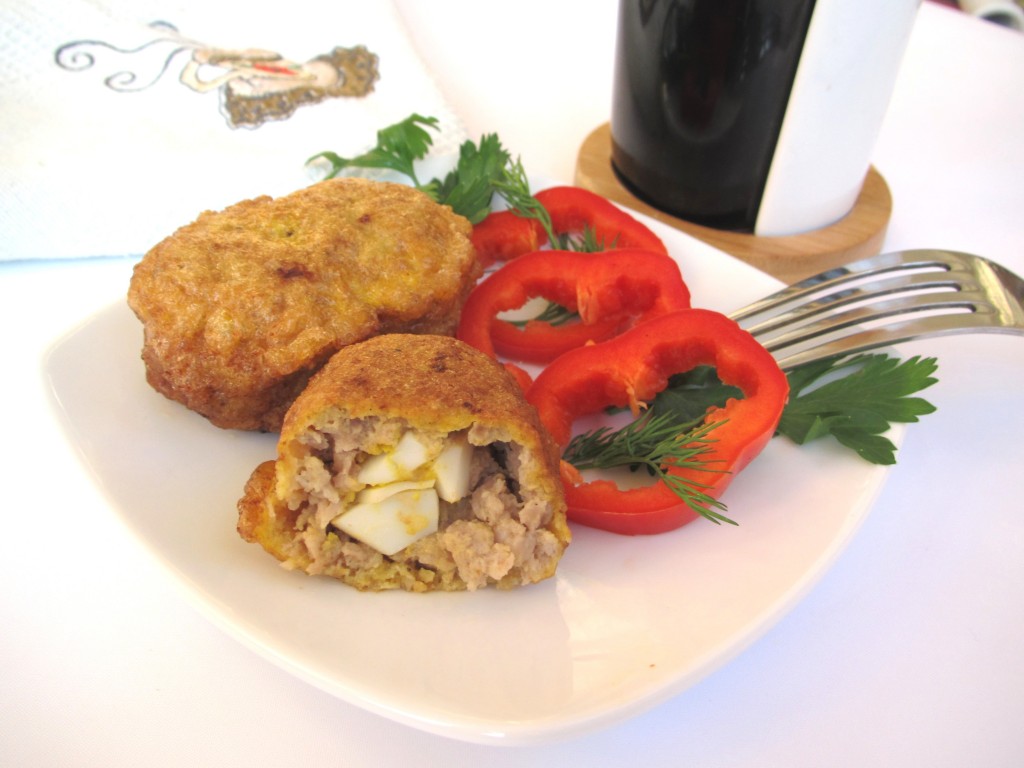 Сочные, аппетитные мясные зразы с яйцом и луком можно подавать к столу, дополнив нарезанными свежими овощами или гарниром.