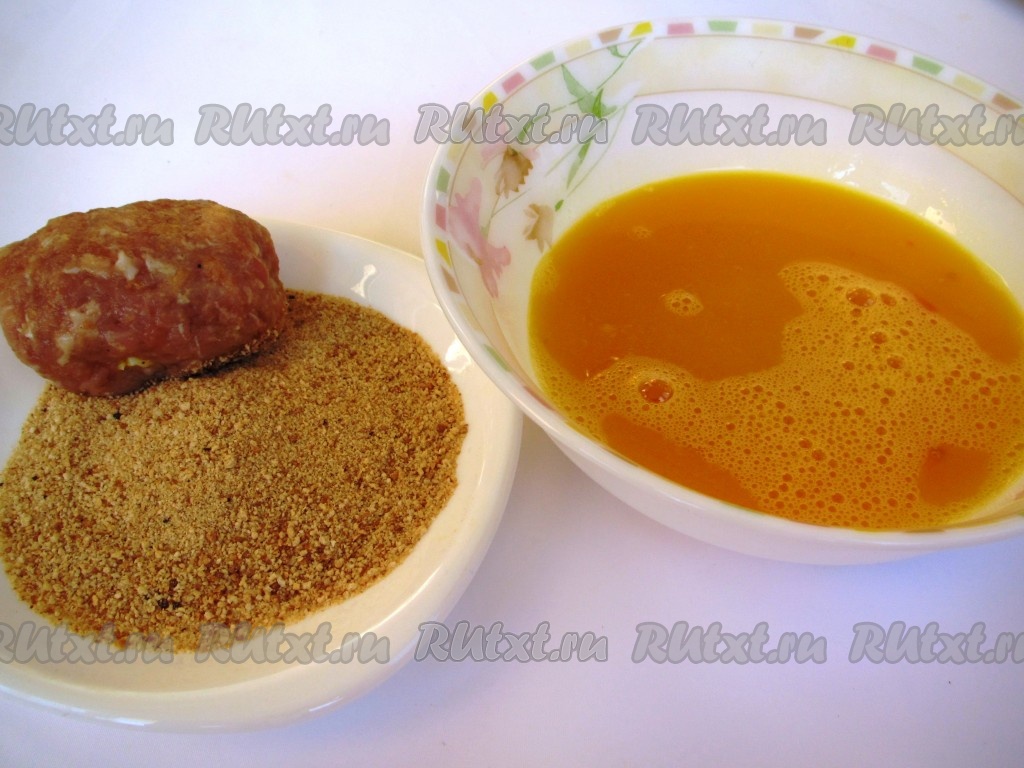 В небольшой и достаточно глубокой ёмкости вилкой слегка взбить 2 яйца с щепоткой соли. На другую тарелку насыпать панировочные сухари. Сначала каждую зразу нужно со всех сторон обвалять в панировочных сухарях, потом полностью покрыть их яичной смесью.
