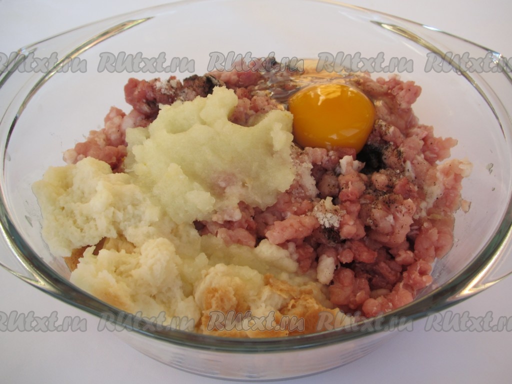 Прежде всего приготовим основу для зраз. Для этого в миску нужно выложить фарш, добавить сырое яйцо, одну очищенную и натёртую на тёрке луковицу, соль, специи. Булку замочить в молоке, оставить на несколько минут, затем лишнюю жидкость отжать. Добавить получившуюся хлебную массу в миску с фаршем. Хорошо вымесить фарш.