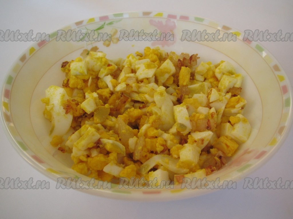 Теперь приготовим начинку для мясных зраз. Для этого одну крупную очищенную луковицу (можно взять 2 средних луковицы) нужно мелко нарезать, выложить в сковороду с растительным маслом и обжарить, периодически помешивая, до золотистого цвета на среднем огне (на это потребуется минут 5), убрать с огня, дать немного остыть. Сварить вкрутую 4 яйца (в течение 9-10 минут после закипания воды), затем дать им полностью остыть, очистить и нарезать на небольшие кубики. В миске соединить обжаренный лук и нарезанные варёные яйца, немного подсолить, перемешать и начинка для зраз готова.