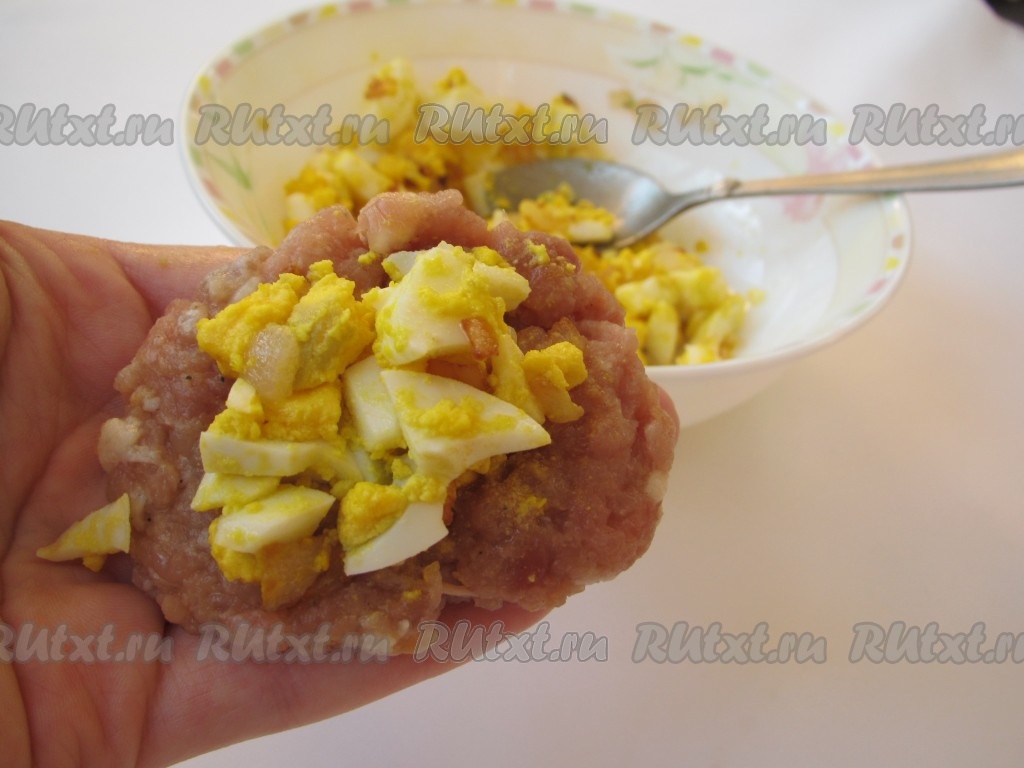 Формируем зразы, для этого на ладони нужно распластать немного мясного фарша, выложить на середину часть яично-луковой начинки и слепить фарш над начинкой, тщательно скрепляя по краям.