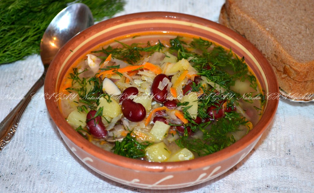 Посыпаем зеленью по желанию. Вкусный суп с фасолью и грибами готов. Надеюсь, вашей семье понравится этот рецепт.