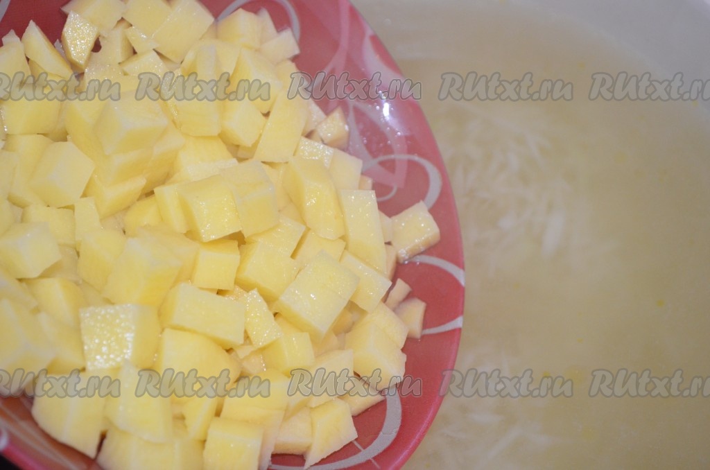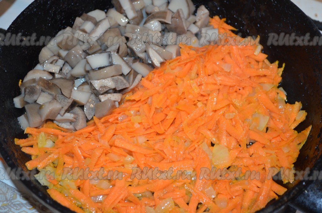Лук порезать кубиками, морковь натереть на тёрке. Сначала обжарить лук на растительном масле до прозрачности, добавить морковь и грибы. Перемешать, обжаривать 5 минут, помешивая, на медленном огне.