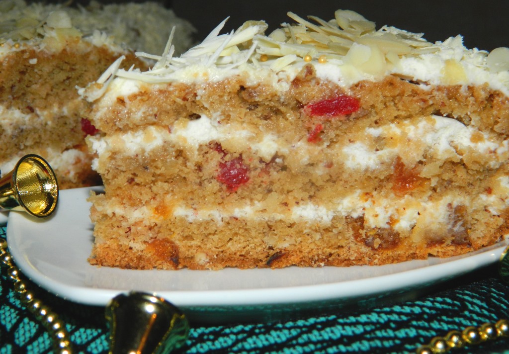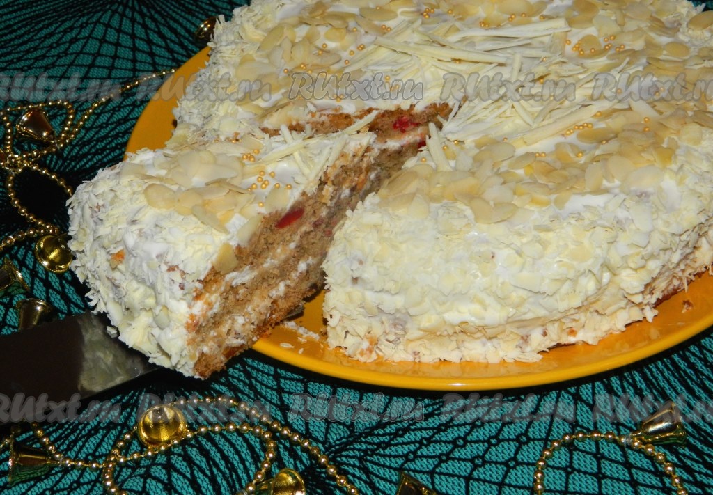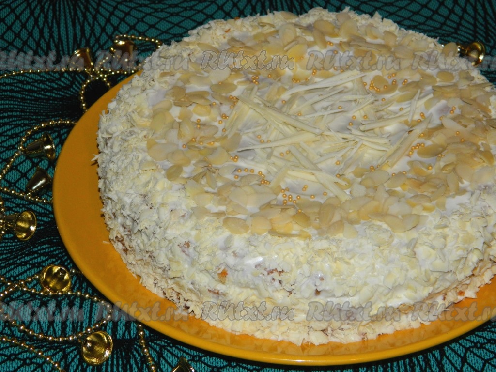 Готовый новогодний торт украшаем белым шоколадом, миндальными лепестками и убираем на несколько часов в холод для пропитки!