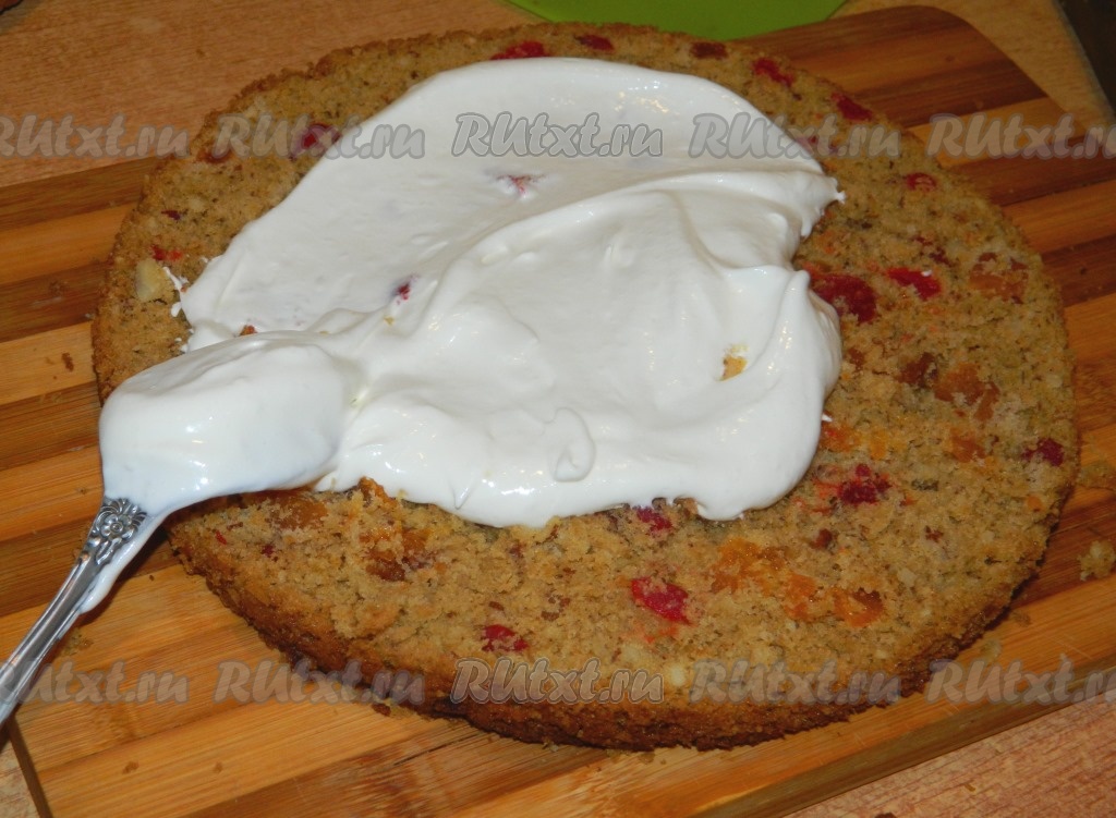 Для приготовления крема взбиваем сметану с сахарной пудрой и смазываем коржи, верх и бока торта.