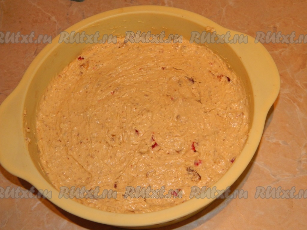 Постепенно добавляем муку. В тесто засыпаем измельченные орехи и сухофрукты. Полученное тесто перекладываем в форму, смазанную маслом, разравниваем и ставим в разогретую духовку на 40 минут при температуре 180 градусов.