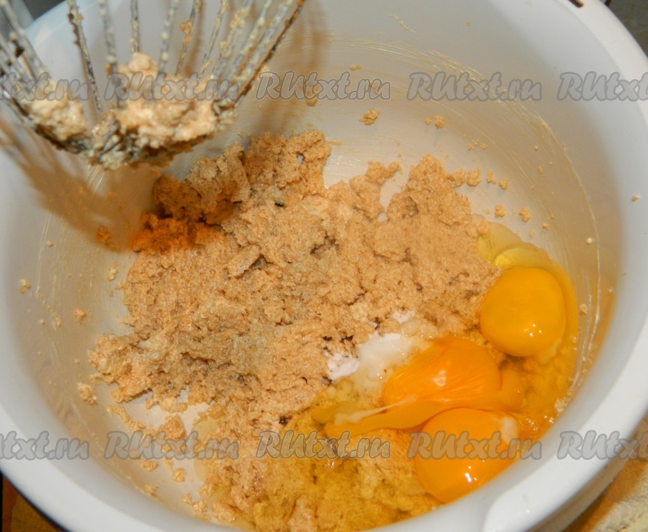 В масляную массу добавляем яйца, ванилин и соду.