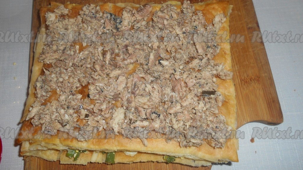Собираем пирог по слоям: 1) корж из слоеного теста; 2) яйца с зеленью; 3) сыр; 4) корж из слоеного теста; 5) рыбные консервы; 6) сыр; 7) корж из слоеного теста; 8) последний слой - яйца с зеленью посыпать сыром. Ставим слоеный пирог в разогретую духовку на 10 минут.
