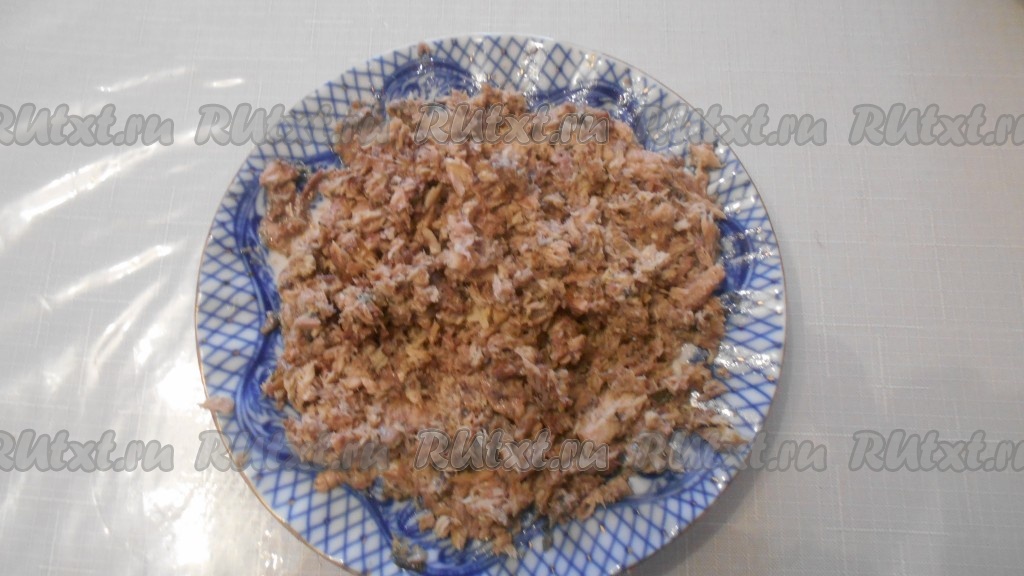 Вилкой измельчить рыбные консервы. Натереть сыр на тёрке.
